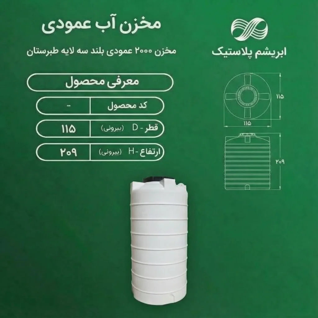 مخزن ۲۰۰۰ لیتری عمودی بلند طبرستان متعادلترین انتخاب از نظر ظرفیت، اشغال فضا و قیمت؛ مناسب ذخیره آب شرب در خانه، ویلا و واحدهای تجاری با طراحی عمودی بلند و مقاومت بالا در برابر نور خورشید.
