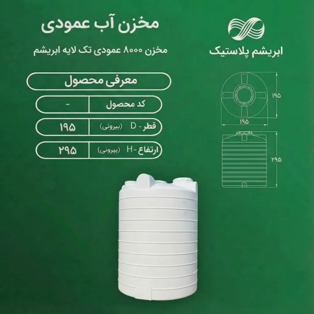 مخزن ۸۰۰۰ لیتری عمودی تکلایه ابریشم پلاستیک یکی از اقتصادیترین و کاربردیترین مخازن ذخیرهسازی آب و مایعات در بازار ایران است. این مدل برای مصارف غیرشرب، آبیاری، باغداری، دامداری، ذخیره آب شهری، مصارف صنعتی سبک و پروژههایی که نیاز به یک مخزن مقرونبهصرفه دارند، انتخابی بسیار مناسب محسوب میشود.