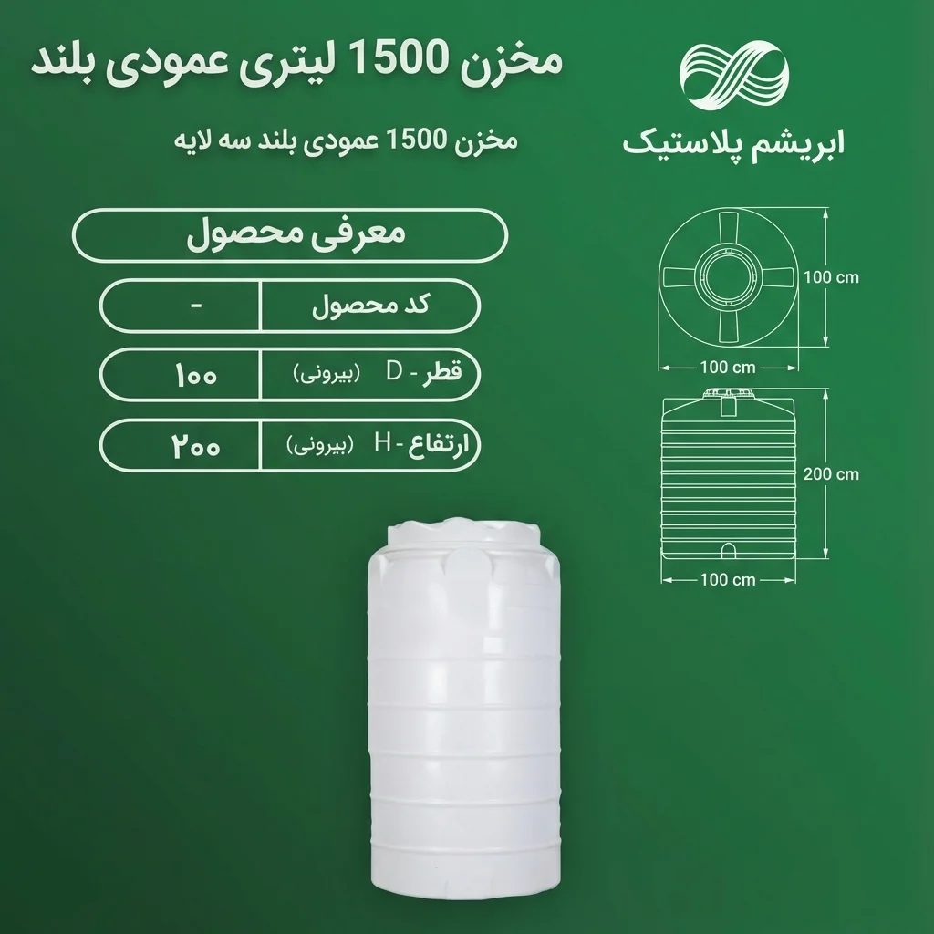 | مخزن عمودی بلند ابریشم | ۱۵۰۰ لیتر | ۱۰۰ | ۲۰۰ | سهلایه ضد جلبک و ضد خزه | ۱۰ سال | مصرف متوسط، فضاهای محدود |