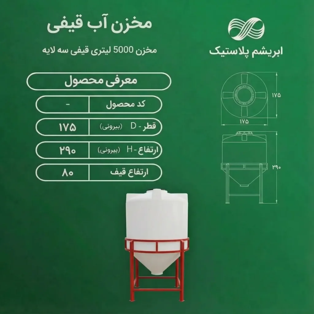 مخزن ۵۰۰۰ لیتری قیفی سهلایه یک گزینه ایدهآل برای ذخیرهسازی آب و سیالات در مصارف صنعتی، ساختمانی، کشاورزی و خانگی با نیاز به ظرفیت متوسط تا بالا است. این محصول از مخازن قیفی با ساختار سهلایه مقاوم و بهداشتی تولید شده و دوام و عملکرد طولانیمدت را تضمین میکند.