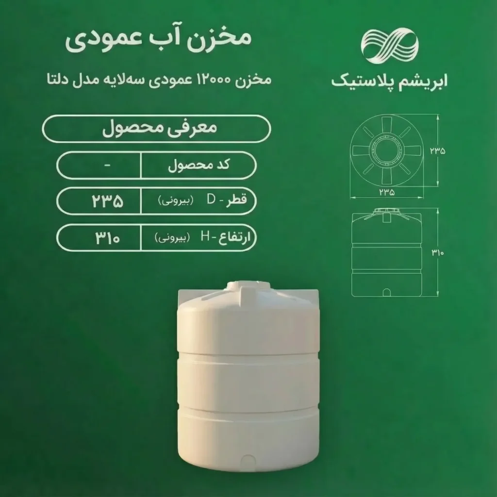 مخزن ۱۲۰۰۰ لیتری عمودی سهلایه مدل دلتا با ساختار ضدجلبک، پلیاتیلن فودگرید و بدنه مقاوم، گزینهای بهداشتی و مطمئن برای ذخیره آب در حجم بالا است از ابریشم پلاستیک.