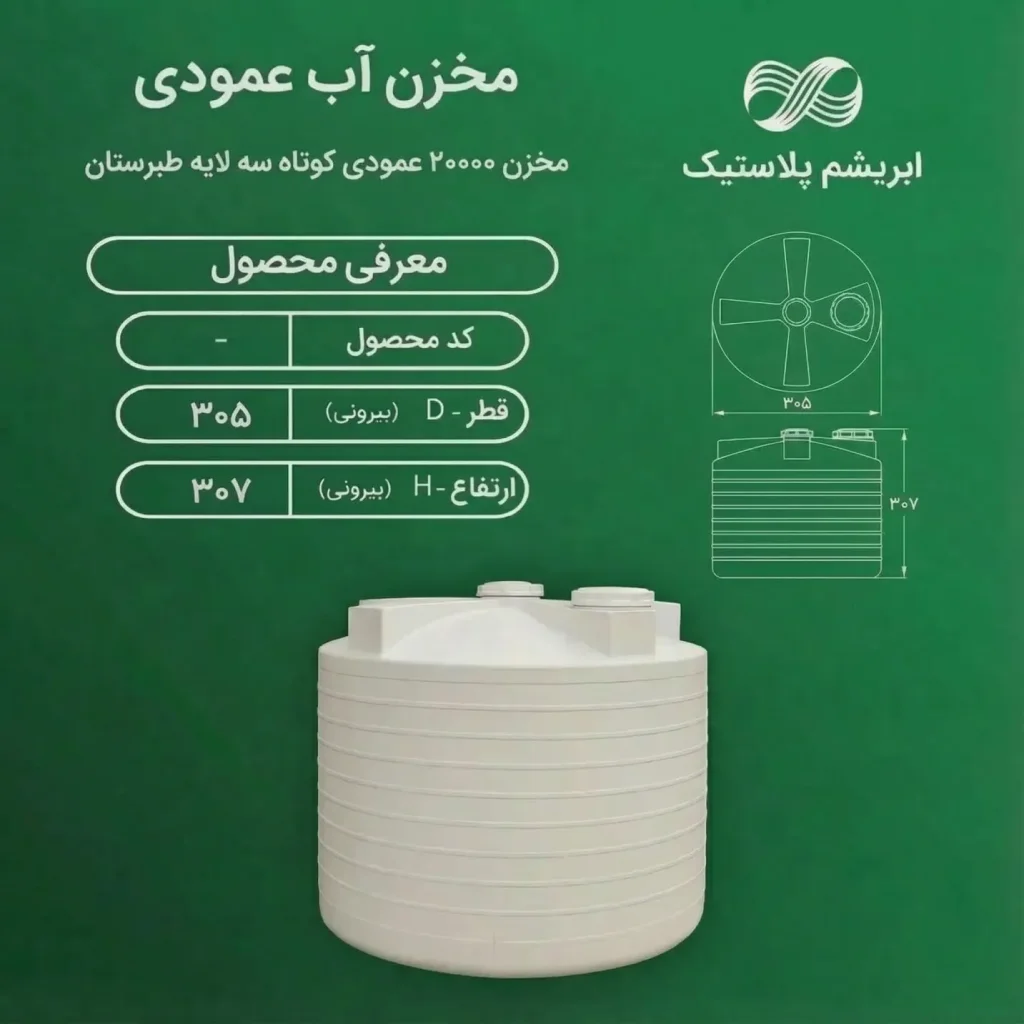 مخزن آب ۲۰۰۰۰ لیتری عمودی کوتاه سهلایه طبرستان یکی از مطمئنترین انتخابهای بازار ایران است، انتخابی که میتوانید با خیال راحت از مجموعه ابریشم پلاستیک تهیه کنید.